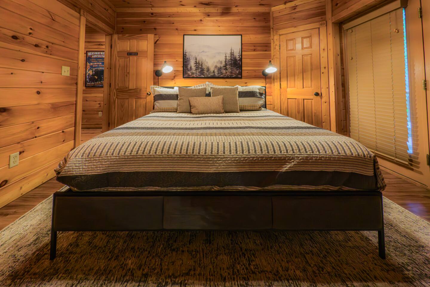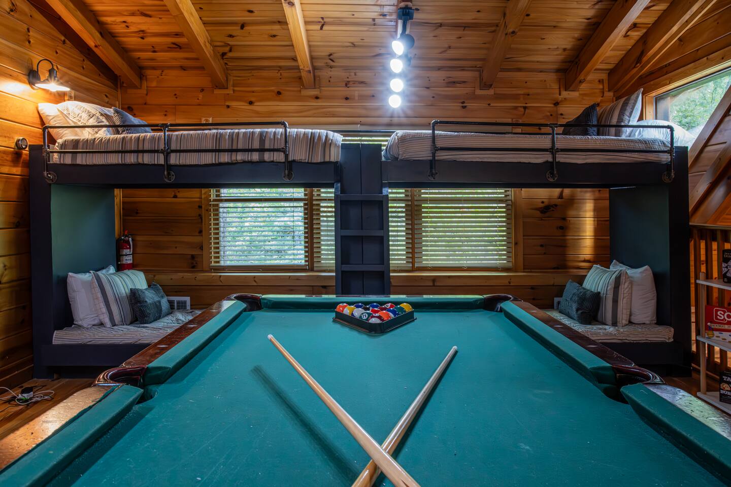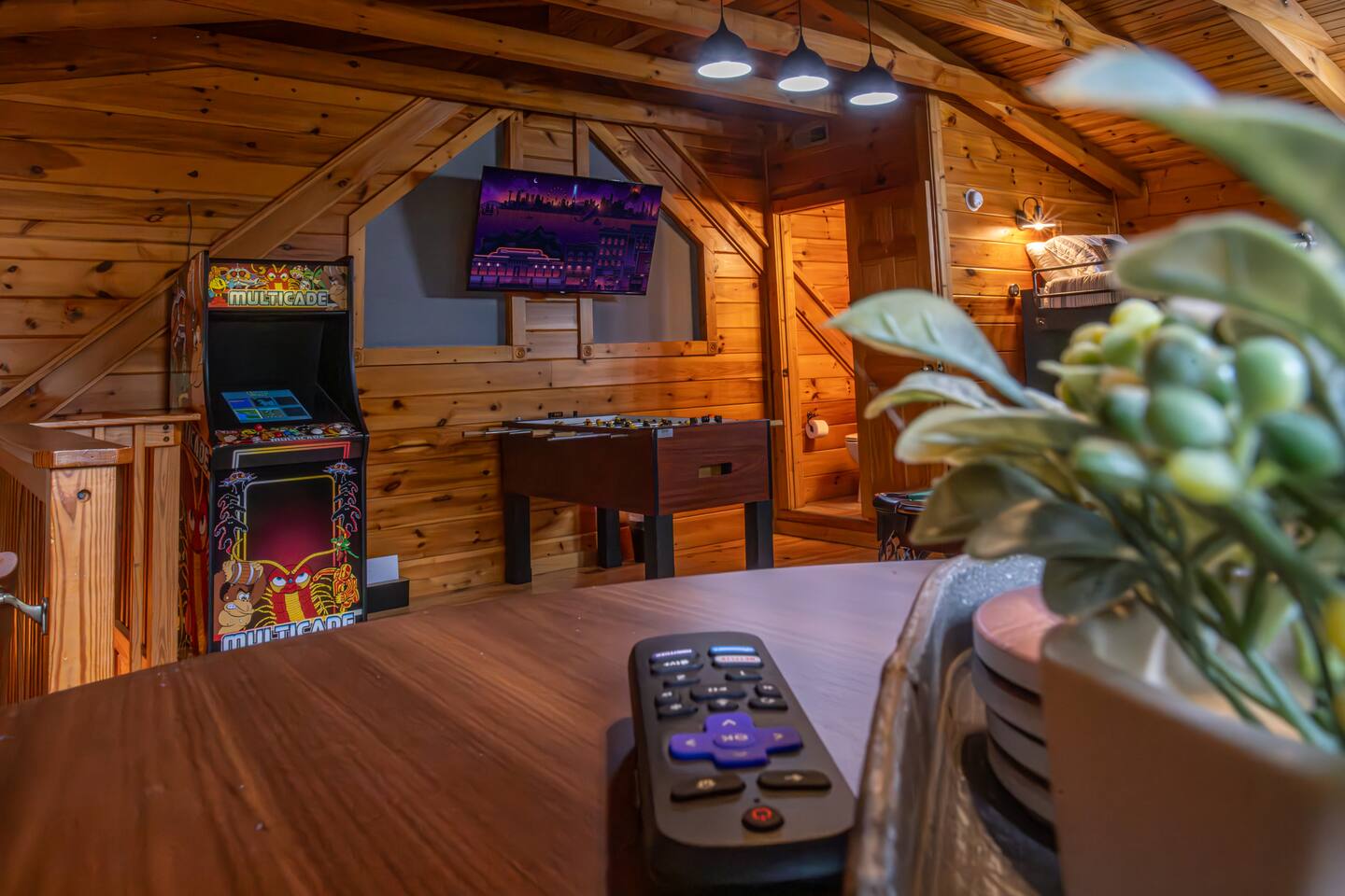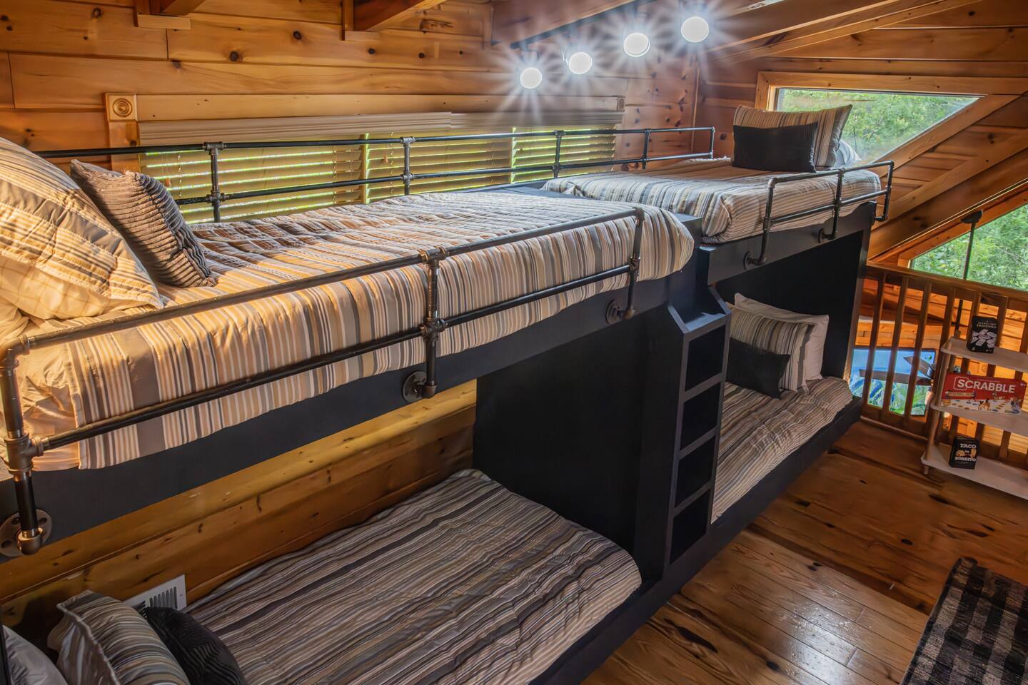 Step into this stunning resort cabin and experience a perfect blend of rustic mountain charm and modern comfort. With five spacious bedrooms, 3.5 baths, and a thoughtfully designed open-concept layout, it offers a serene retreat ideal for families and groups. The cozy living room invites you to unwind with plush sofas, two comfy armchairs, and a beautiful electric fireplace. A large wall-mounted TV sits above, creating a perfect spot for movie nights. The sofa easily converts into a queen bed, providing additional space for up to two more guests. Prepare anything from morning pancakes to gourmet dinners in the fully equipped kitchen, which includes a fridge with an ice maker, a full stove and oven, a microwave, a coffee maker, and a dishwasher. Enjoy your meals together around the spacious dining table or the breakfast nook set for four. Retreat to the five tastefully decorated bedrooms spread across the three levels. Each features soft bedding, ample closet space, and a peaceful forest view. The master bedroom on the main floor boasts a king-size bed and an en suite bath, while the upstairs loft offers a built-in 4 twin bunks and a private den area. The lower level is perfect for families, with three more bedrooms, all with comfy king beds. Three and a half bathrooms, each sparkling clean, with walk-in showers, complete with fluffy towels and essential toiletries. For fun, head to the game room with an arcade console, or step outside to the covered deck. Relax in a swing on the top deck, dine al fresco with the BBQ, or take a soothing soak in the hot tub while soaking up views of the surrounding woodlands. As part of a premium resort, you’ll also have access to a seasonal community pool—perfect for a refreshing dip during warm summer days. Whether you’re planning a relaxing escape or a mountain adventure, this cabin offers everything you need for an unforgettable stay in Gatlinburg.