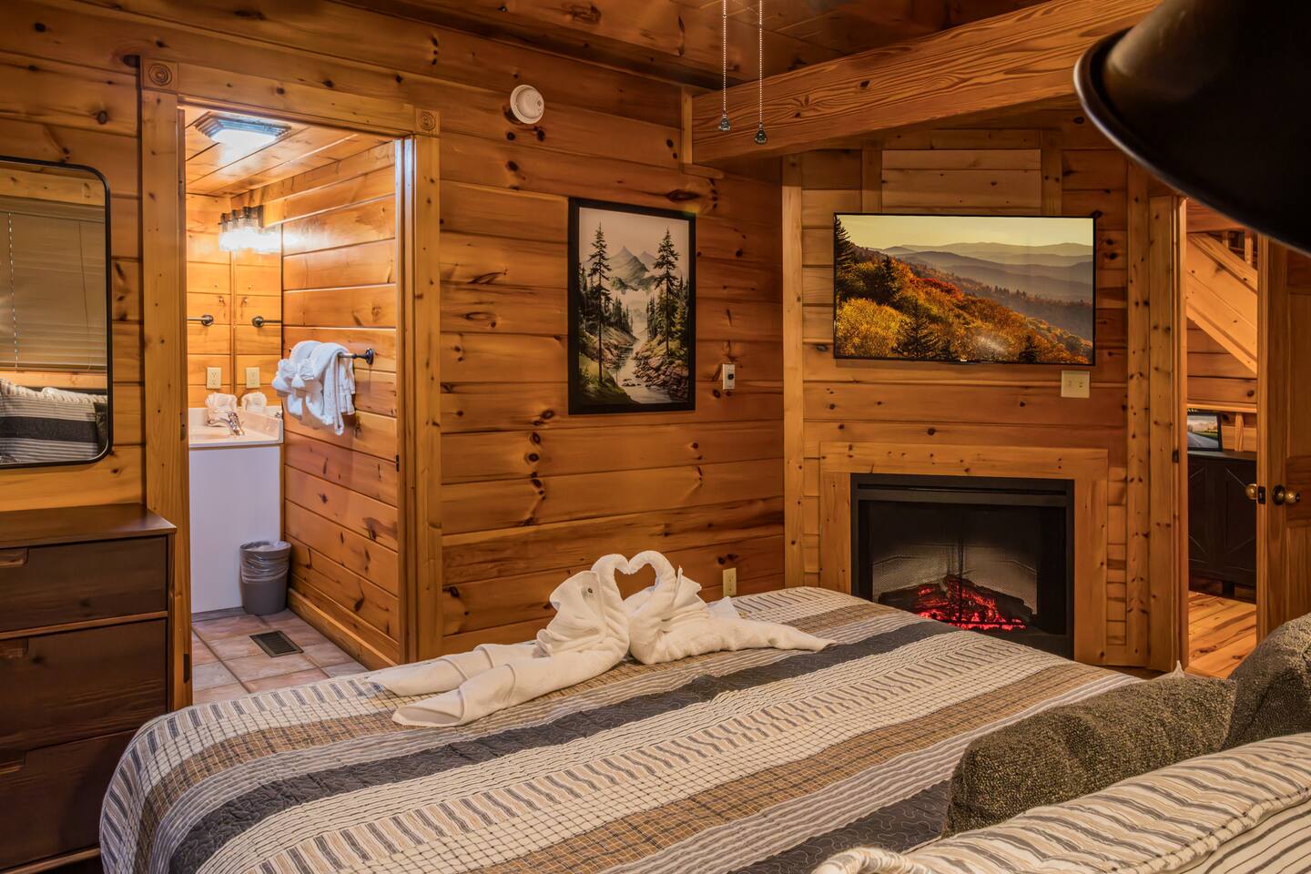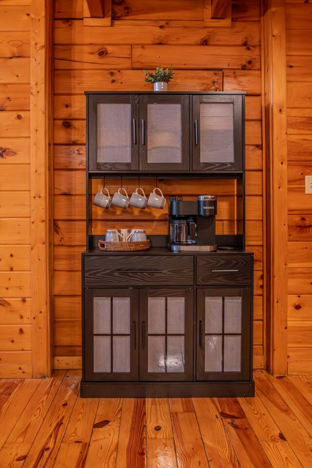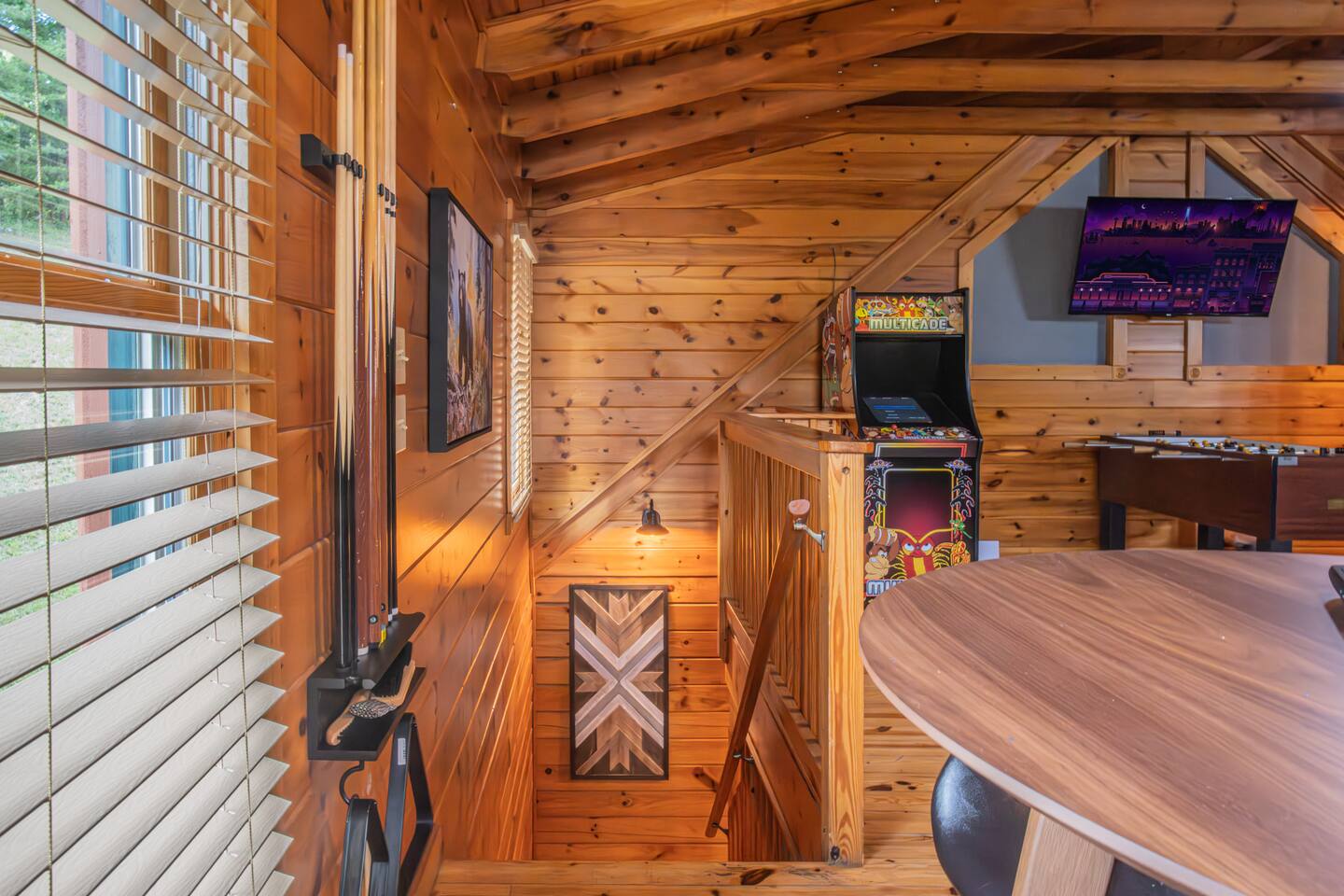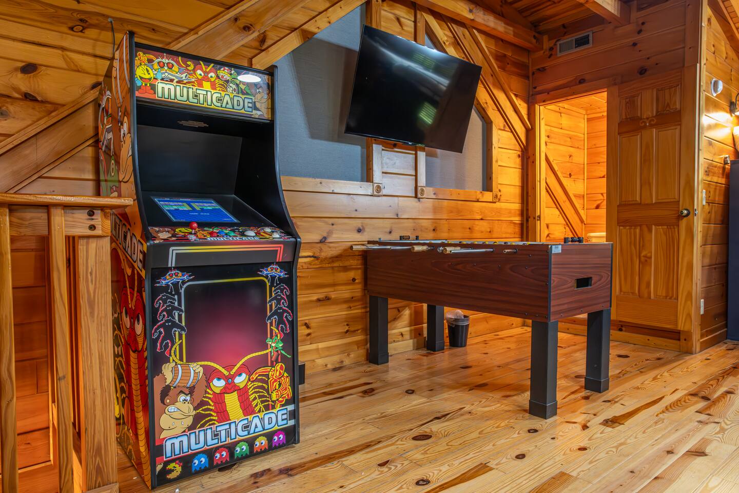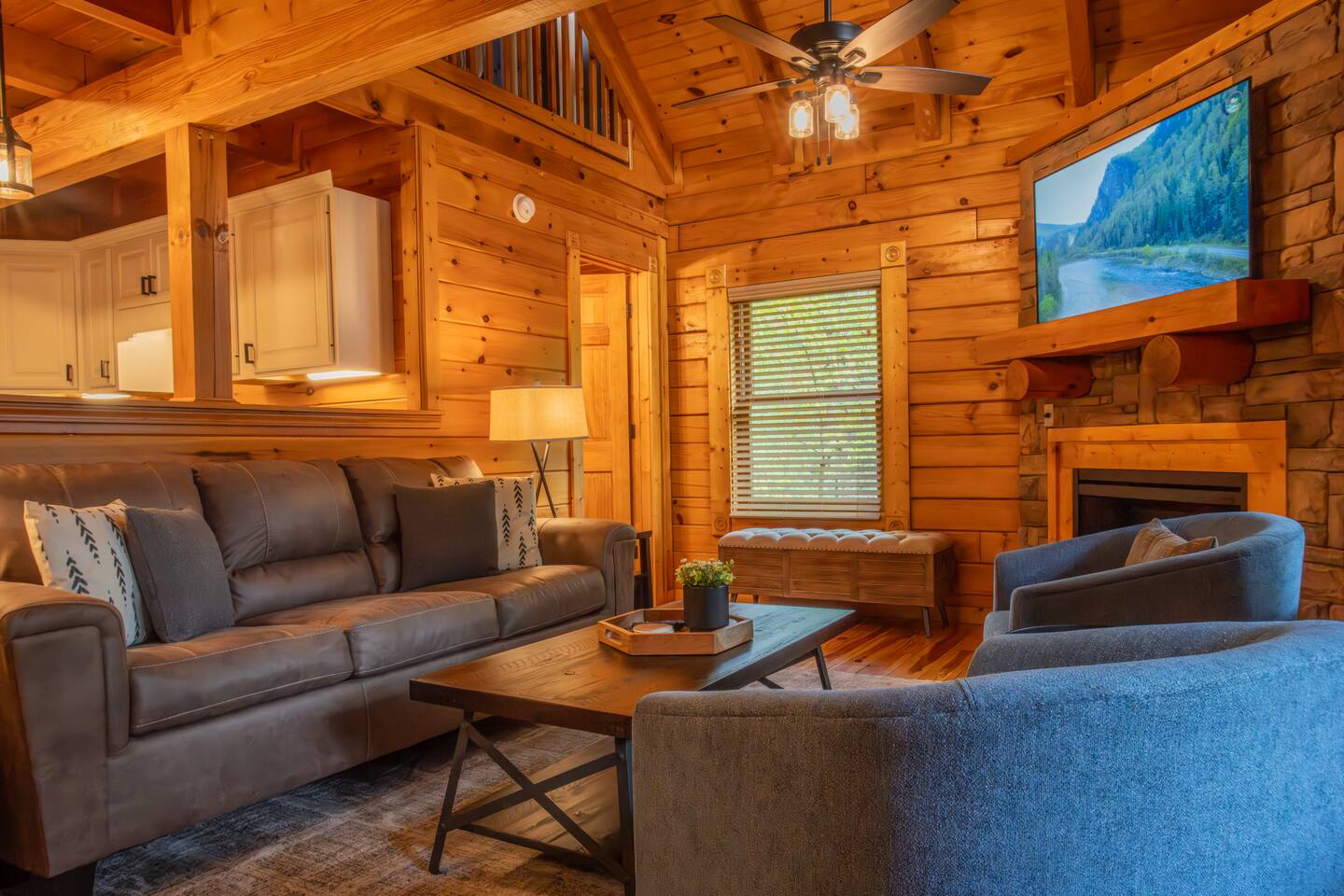 Step into this stunning resort cabin and experience a perfect blend of rustic mountain charm and modern comfort. With five spacious bedrooms, 3.5 baths, and a thoughtfully designed open-concept layout, it offers a serene retreat ideal for families and groups. The cozy living room invites you to unwind with plush sofas, two comfy armchairs, and a beautiful electric fireplace. A large wall-mounted TV sits above, creating a perfect spot for movie nights. The sofa easily converts into a queen bed, providing additional space for up to two more guests. Prepare anything from morning pancakes to gourmet dinners in the fully equipped kitchen, which includes a fridge with an ice maker, a full stove and oven, a microwave, a coffee maker, and a dishwasher. Enjoy your meals together around the spacious dining table or the breakfast nook set for four. Retreat to the five tastefully decorated bedrooms spread across the three levels. Each features soft bedding, ample closet space, and a peaceful forest view. The master bedroom on the main floor boasts a king-size bed and an en suite bath, while the upstairs loft offers a built-in 4 twin bunks and a private den area. The lower level is perfect for families, with three more bedrooms, all with comfy king beds. Three and a half bathrooms, each sparkling clean, with walk-in showers, complete with fluffy towels and essential toiletries. For fun, head to the game room with an arcade console, or step outside to the covered deck. Relax in a swing on the top deck, dine al fresco with the BBQ, or take a soothing soak in the hot tub while soaking up views of the surrounding woodlands. As part of a premium resort, you’ll also have access to a seasonal community pool—perfect for a refreshing dip during warm summer days. Whether you’re planning a relaxing escape or a mountain adventure, this cabin offers everything you need for an unforgettable stay in Gatlinburg.