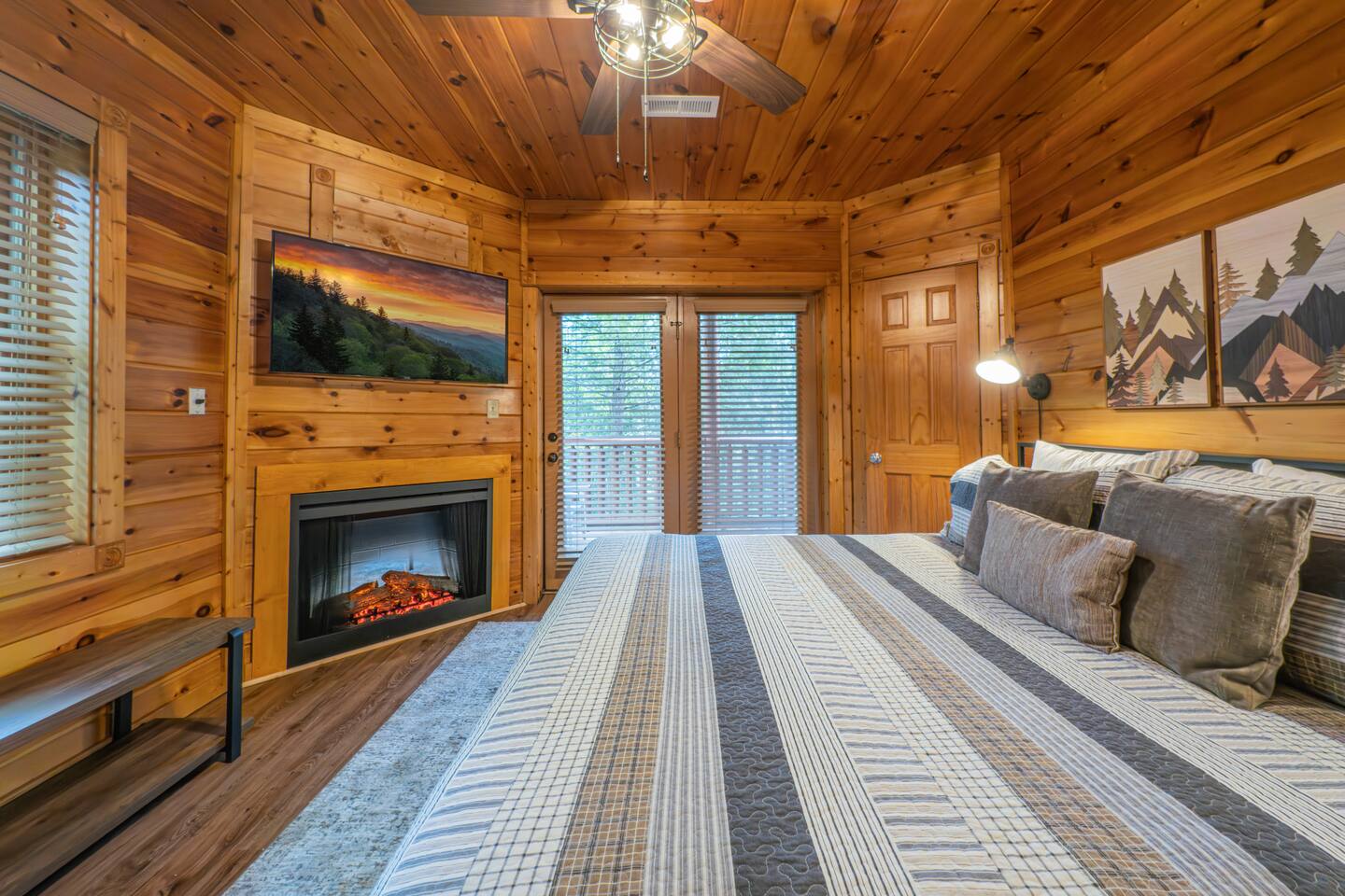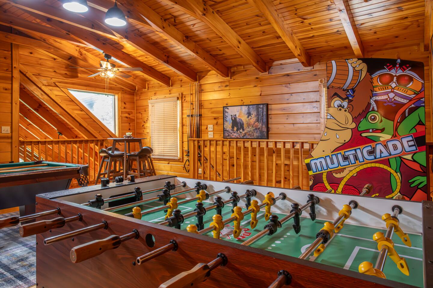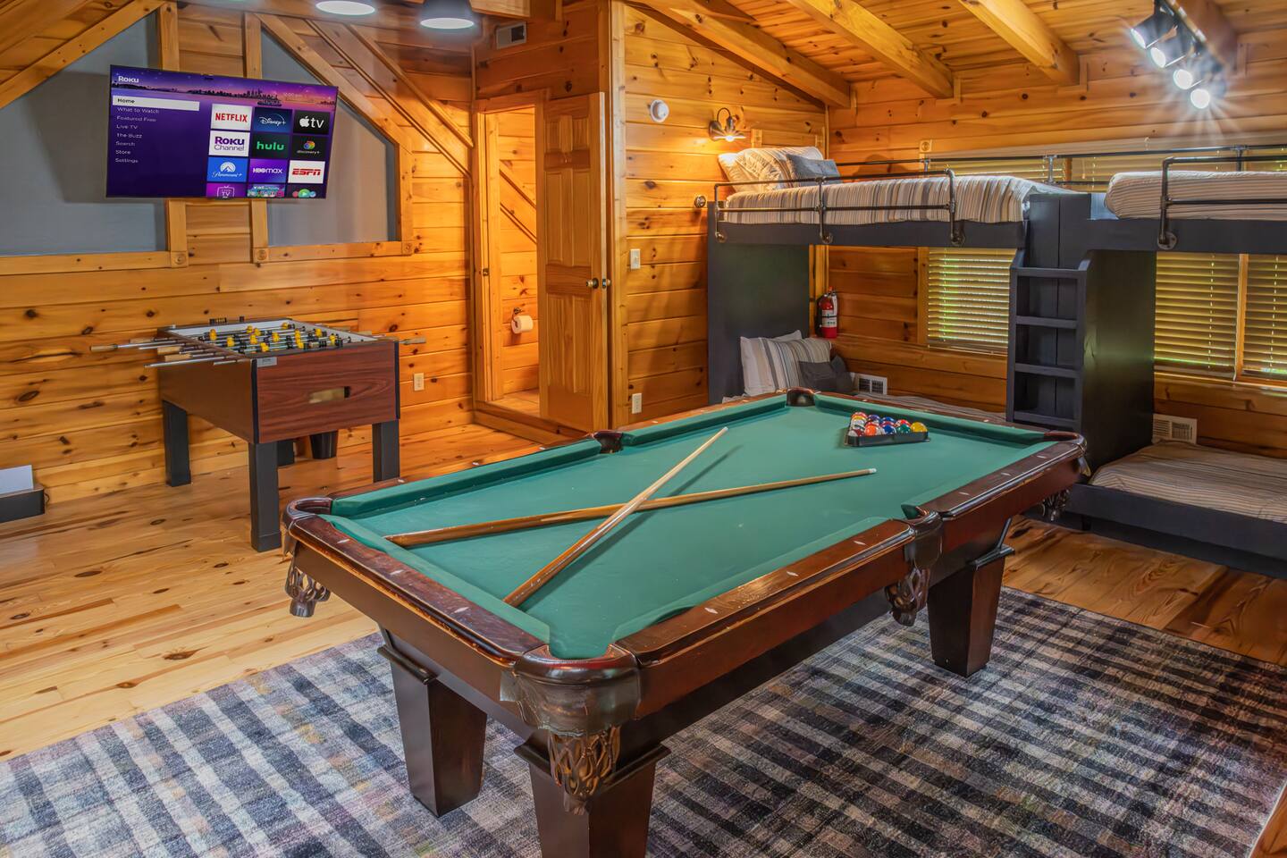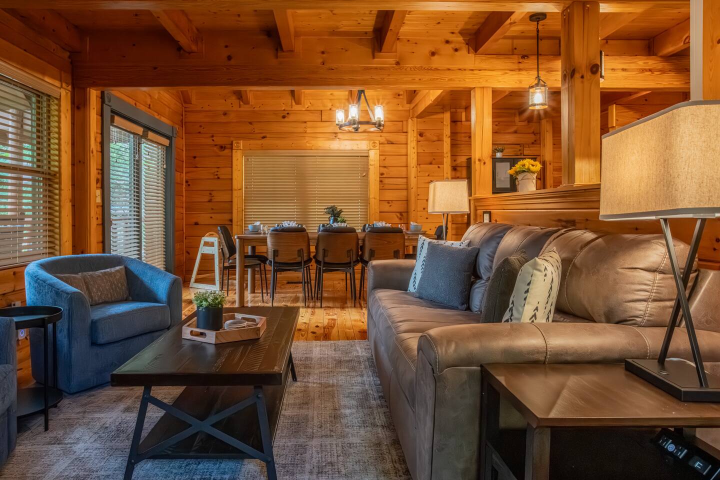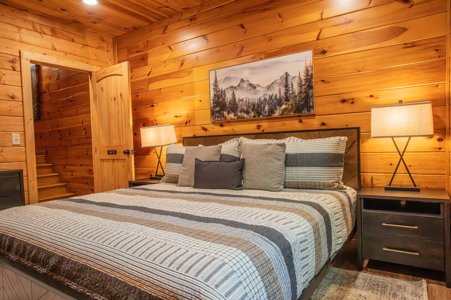 Step into this stunning resort cabin and experience a perfect blend of rustic mountain charm and modern comfort. With five spacious bedrooms, 3.5 baths, and a thoughtfully designed open-concept layout, it offers a serene retreat ideal for families and groups. The cozy living room invites you to unwind with plush sofas, two comfy armchairs, and a beautiful electric fireplace. A large wall-mounted TV sits above, creating a perfect spot for movie nights. The sofa easily converts into a queen bed, providing additional space for up to two more guests. Prepare anything from morning pancakes to gourmet dinners in the fully equipped kitchen, which includes a fridge with an ice maker, a full stove and oven, a microwave, a coffee maker, and a dishwasher. Enjoy your meals together around the spacious dining table or the breakfast nook set for four. Retreat to the five tastefully decorated bedrooms spread across the three levels. Each features soft bedding, ample closet space, and a peaceful forest view. The master bedroom on the main floor boasts a king-size bed and an en suite bath, while the upstairs loft offers a built-in 4 twin bunks and a private den area. The lower level is perfect for families, with three more bedrooms, all with comfy king beds. Three and a half bathrooms, each sparkling clean, with walk-in showers, complete with fluffy towels and essential toiletries. For fun, head to the game room with an arcade console, or step outside to the covered deck. Relax in a swing on the top deck, dine al fresco with the BBQ, or take a soothing soak in the hot tub while soaking up views of the surrounding woodlands. As part of a premium resort, you’ll also have access to a seasonal community pool—perfect for a refreshing dip during warm summer days. Whether you’re planning a relaxing escape or a mountain adventure, this cabin offers everything you need for an unforgettable stay in Gatlinburg.