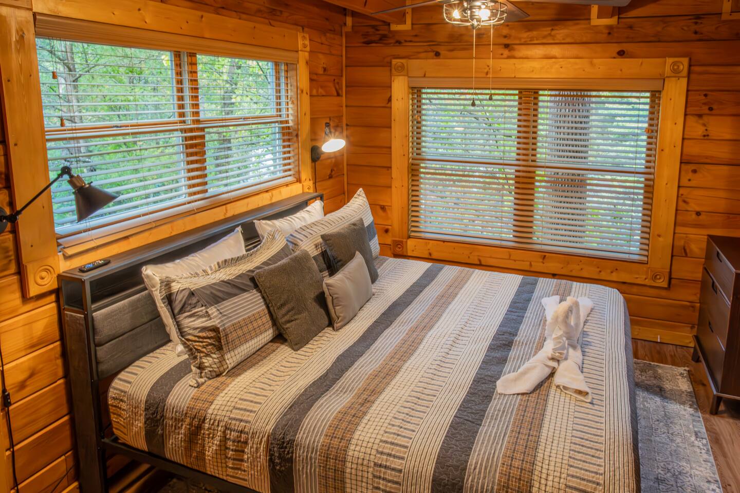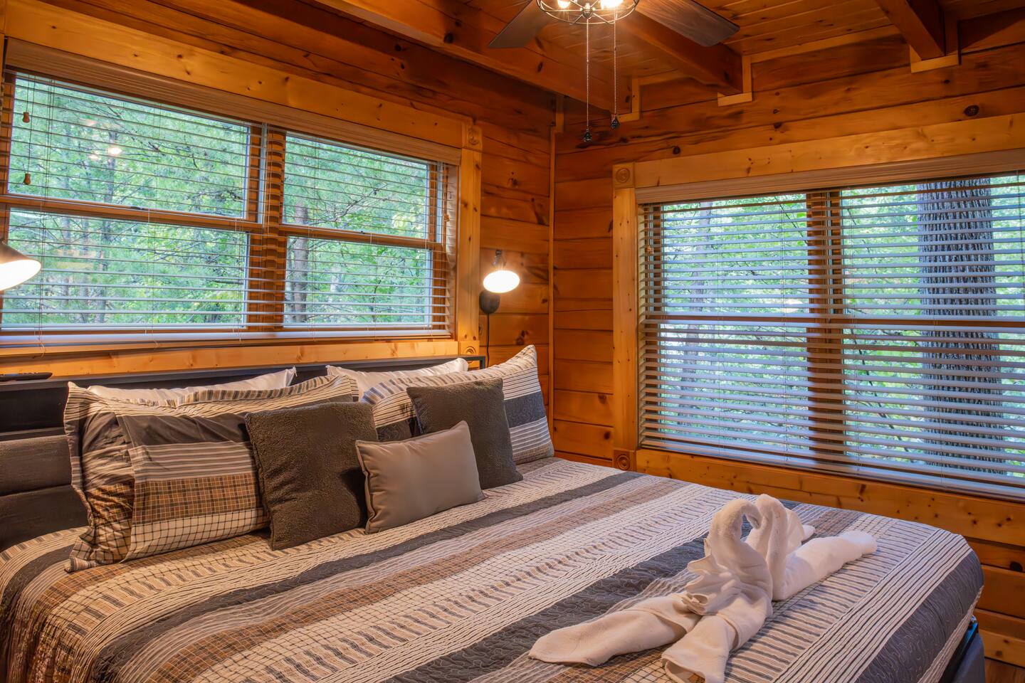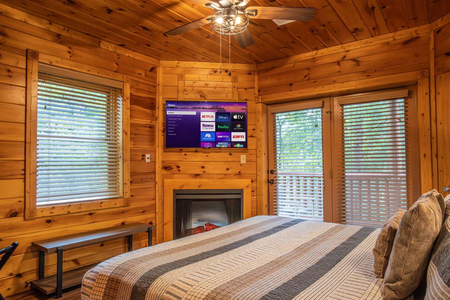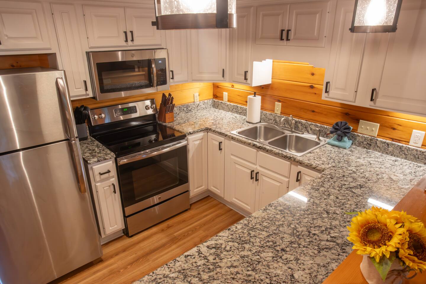 Step into this stunning resort cabin and experience a perfect blend of rustic mountain charm and modern comfort. With five spacious bedrooms, 3.5 baths, and a thoughtfully designed open-concept layout, it offers a serene retreat ideal for families and groups. The cozy living room invites you to unwind with plush sofas, two comfy armchairs, and a beautiful electric fireplace. A large wall-mounted TV sits above, creating a perfect spot for movie nights. The sofa easily converts into a queen bed, providing additional space for up to two more guests. Prepare anything from morning pancakes to gourmet dinners in the fully equipped kitchen, which includes a fridge with an ice maker, a full stove and oven, a microwave, a coffee maker, and a dishwasher. Enjoy your meals together around the spacious dining table or the breakfast nook set for four. Retreat to the five tastefully decorated bedrooms spread across the three levels. Each features soft bedding, ample closet space, and a peaceful forest view. The master bedroom on the main floor boasts a king-size bed and an en suite bath, while the upstairs loft offers a built-in 4 twin bunks and a private den area. The lower level is perfect for families, with three more bedrooms, all with comfy king beds. Three and a half bathrooms, each sparkling clean, with walk-in showers, complete with fluffy towels and essential toiletries. For fun, head to the game room with an arcade console, or step outside to the covered deck. Relax in a swing on the top deck, dine al fresco with the BBQ, or take a soothing soak in the hot tub while soaking up views of the surrounding woodlands. As part of a premium resort, you’ll also have access to a seasonal community pool—perfect for a refreshing dip during warm summer days. Whether you’re planning a relaxing escape or a mountain adventure, this cabin offers everything you need for an unforgettable stay in Gatlinburg.