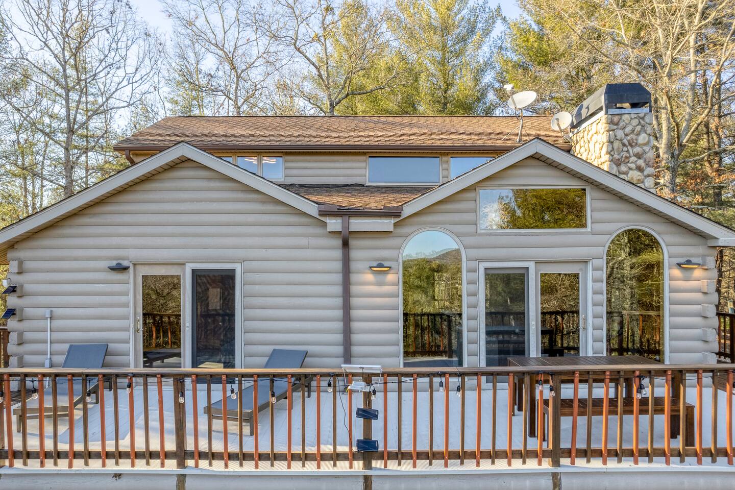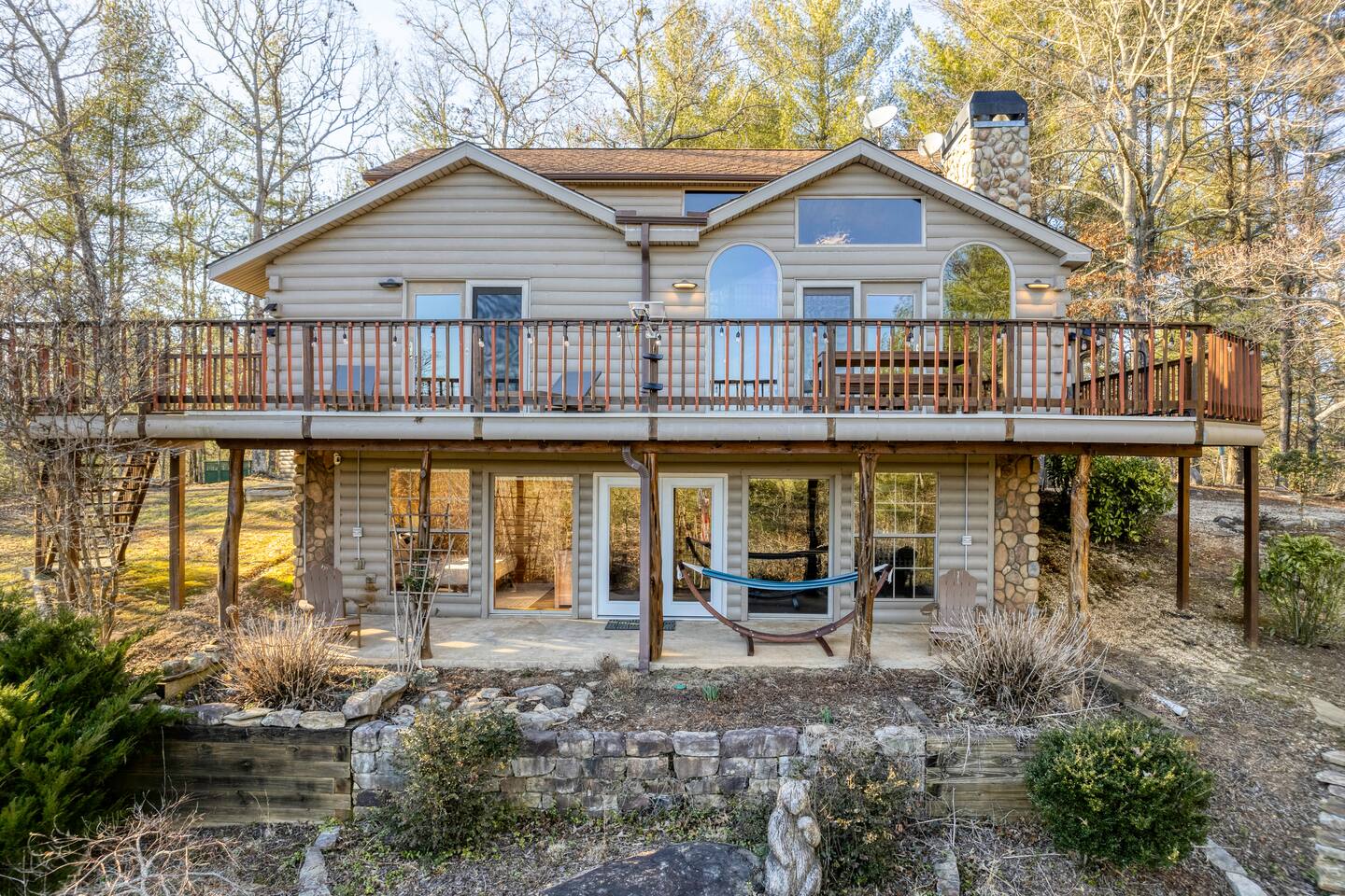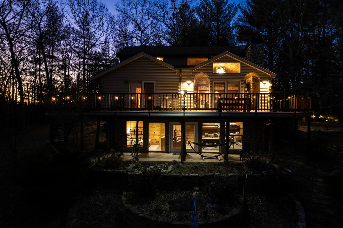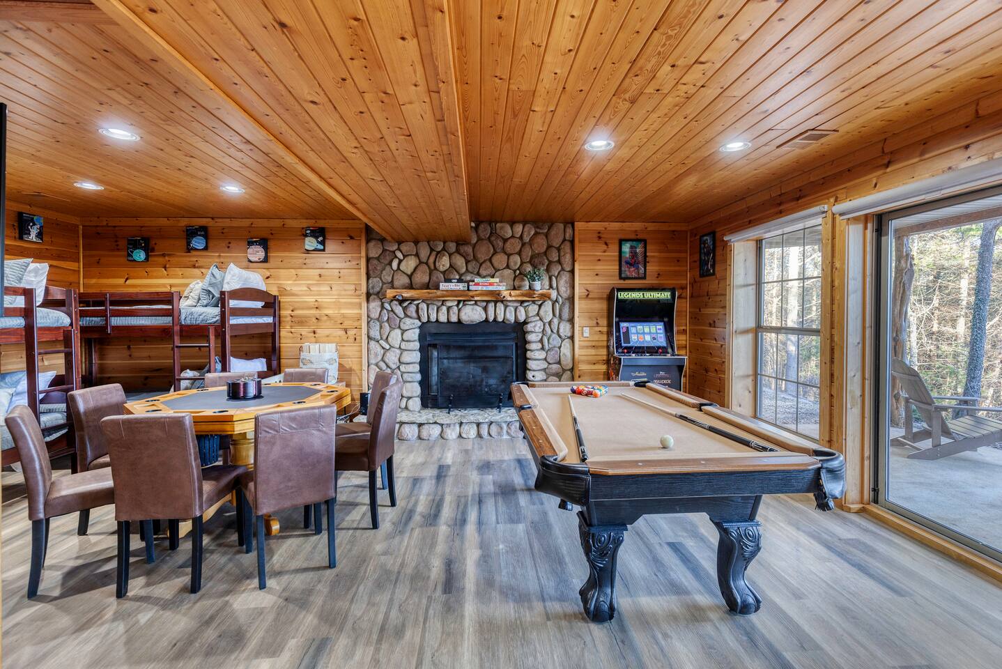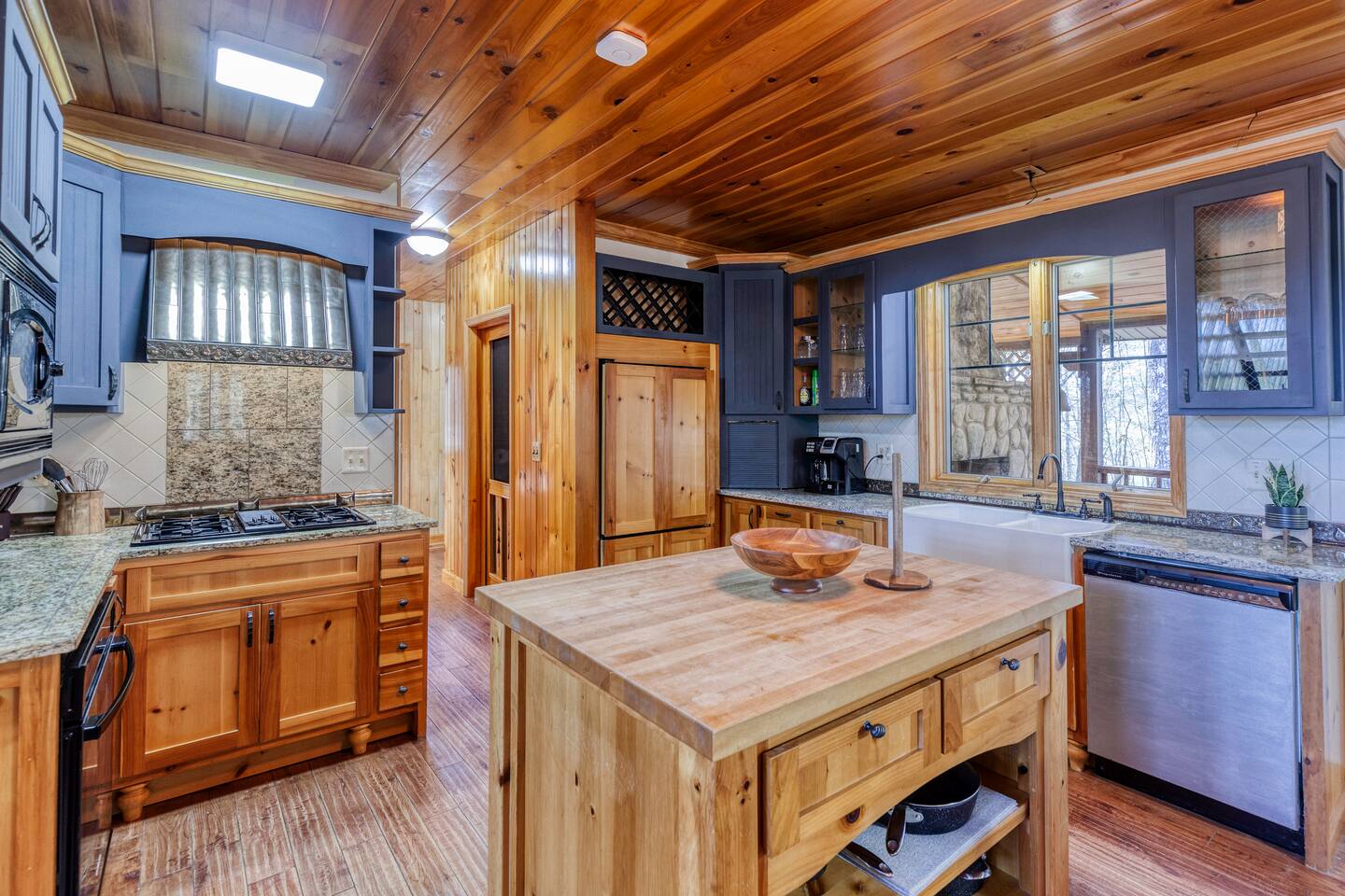 Make your way inside this custom-built cabin to experience the ultimate in entertainment, relaxation, and style all within your own secluded estate surrounded by trees and stunning mountain views. The living space is the heart of the home with high vaulted ceilings and a wall of custom windows filling the space with light. Here you can relax on the large modular lounge while you stream all your favorites on the wall-mounted TV by the warming stone fireplace. Step down into the modern kitchen that comes fully equipped with everything you could need for your stay. There is a full-size fridge/freezer, a large oven and stovetop, a microwave, and even a dishwasher to take care of all the cleaning up. Enjoy your meals surrounded by friends and family at the dining table, or head outside and eat alfresco style on the wrap-around porch or down below with a BBQ area, an outdoor fireplace, and an outdoor lounge to keep you comfortable. You are spoilt for choice with a selection of six bedrooms over the three levels of the cabin. Each room offers comfortable beds topped in soft, quality linen and plenty of space to unpack and make yourself at home. The master bedroom on the main floor consists of a luxuriously large king bed, access to the porch, and an adjoining ensuite with a large shower and a relaxing jacuzzi that sits by the bay window. Upstairs you will find an additional two king bedrooms along with a queen bedroom and a central bathroom with a dual vanity filled with all the essentials and plenty of soft, fluffy towels. On the basement level are an additional full bathroom, the fifth bedroom with a king bed, and the bunk room with four twin beds that shares its space with a fun games room where you can play poker, get out a board game, play pool or get a high score on the arcade games. From here guests can step out into the expansive yard, take a dip in the warm hot tub, sit by the pond, light up the fire pit and roast marshmallows or just take in the stunning scenery and explore the wooded areas. So for a true mountain escape that offers all the modern comforts of home while still being conveniently located just 20 minutes to Downtown Blue Ridge and only minutes to all the fun, adventure, and excitement that this area has to offer – look no further than this stylish lodge style cabin for your next getaway.