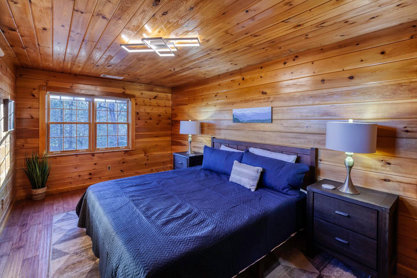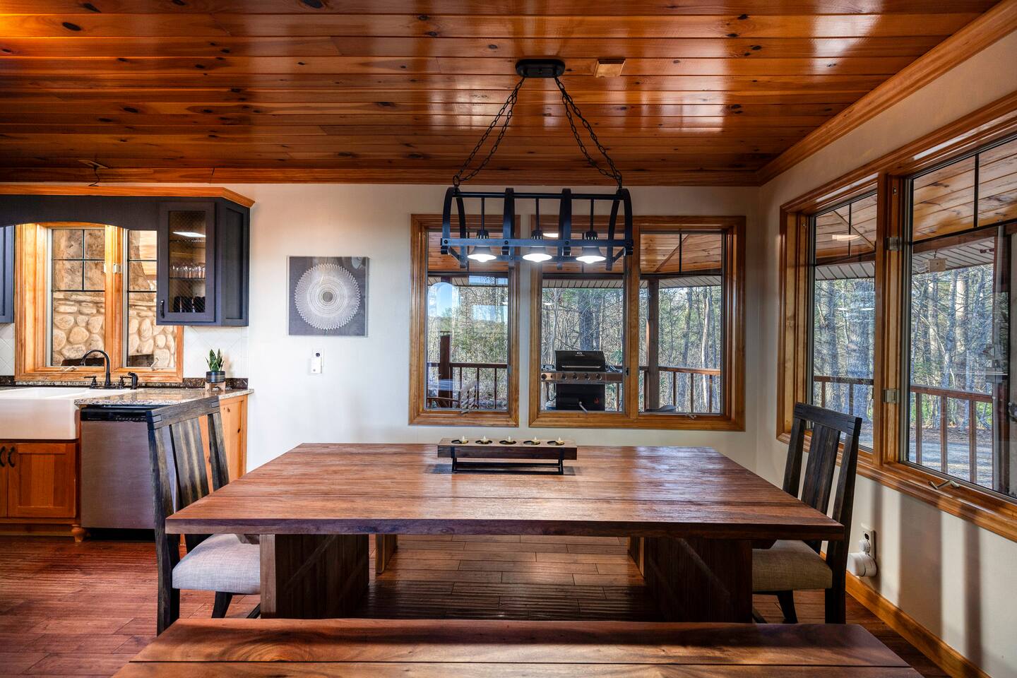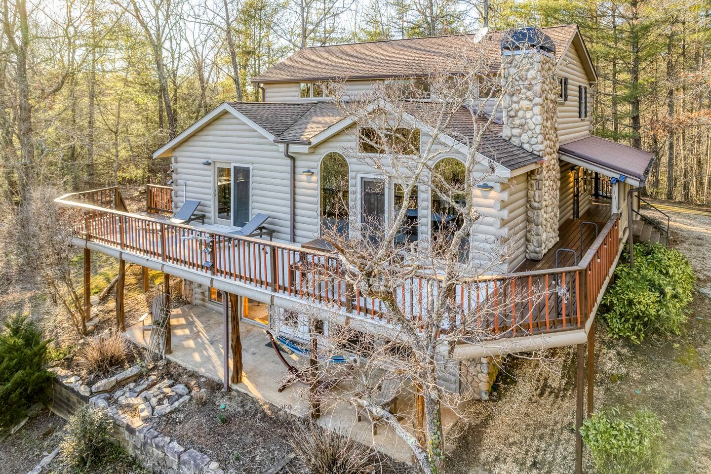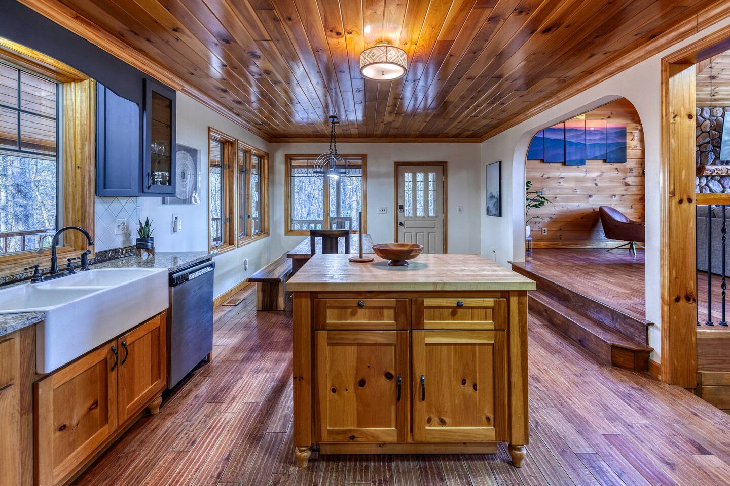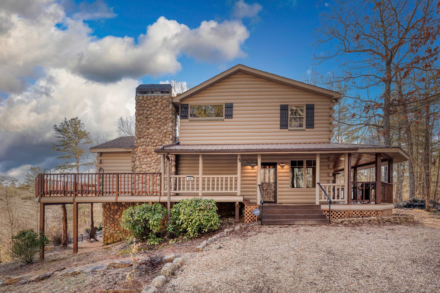 Make your way inside this custom-built cabin to experience the ultimate in entertainment, relaxation, and style all within your own secluded estate surrounded by trees and stunning mountain views. The living space is the heart of the home with high vaulted ceilings and a wall of custom windows filling the space with light. Here you can relax on the large modular lounge while you stream all your favorites on the wall-mounted TV by the warming stone fireplace. Step down into the modern kitchen that comes fully equipped with everything you could need for your stay. There is a full-size fridge/freezer, a large oven and stovetop, a microwave, and even a dishwasher to take care of all the cleaning up. Enjoy your meals surrounded by friends and family at the dining table, or head outside and eat alfresco style on the wrap-around porch or down below with a BBQ area, an outdoor fireplace, and an outdoor lounge to keep you comfortable. You are spoilt for choice with a selection of six bedrooms over the three levels of the cabin. Each room offers comfortable beds topped in soft, quality linen and plenty of space to unpack and make yourself at home. The master bedroom on the main floor consists of a luxuriously large king bed, access to the porch, and an adjoining ensuite with a large shower and a relaxing jacuzzi that sits by the bay window. Upstairs you will find an additional two king bedrooms along with a queen bedroom and a central bathroom with a dual vanity filled with all the essentials and plenty of soft, fluffy towels. On the basement level are an additional full bathroom, the fifth bedroom with a king bed, and the bunk room with four twin beds that shares its space with a fun games room where you can play poker, get out a board game, play pool or get a high score on the arcade games. From here guests can step out into the expansive yard, take a dip in the warm hot tub, sit by the pond, light up the fire pit and roast marshmallows or just take in the stunning scenery and explore the wooded areas. So for a true mountain escape that offers all the modern comforts of home while still being conveniently located just 20 minutes to Downtown Blue Ridge and only minutes to all the fun, adventure, and excitement that this area has to offer – look no further than this stylish lodge style cabin for your next getaway.