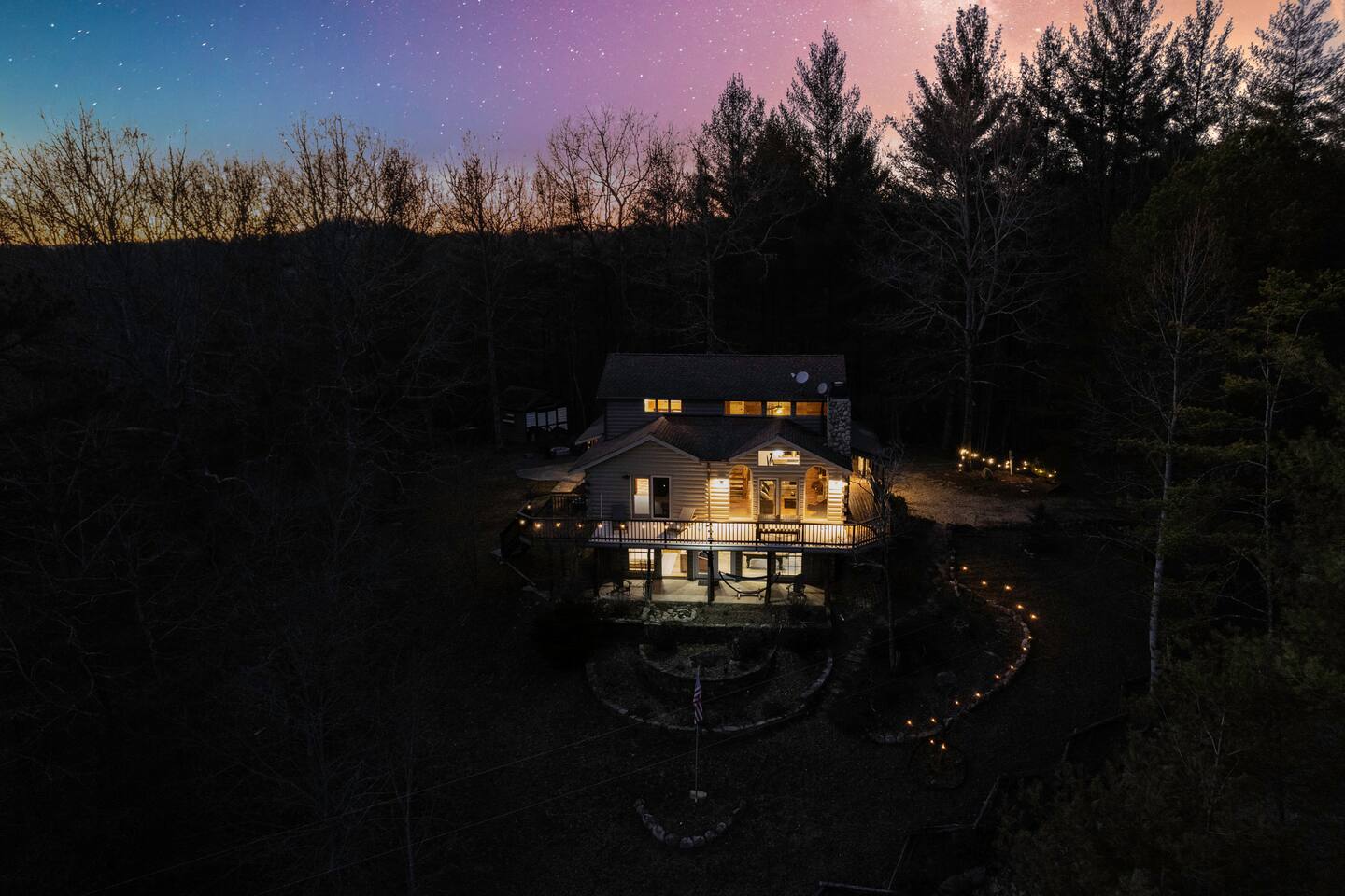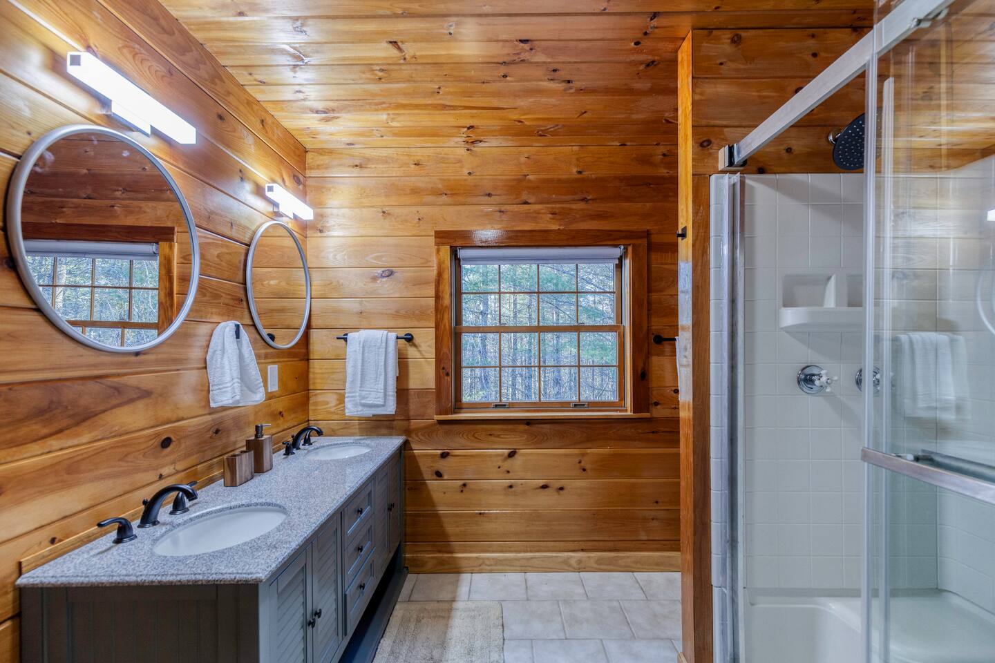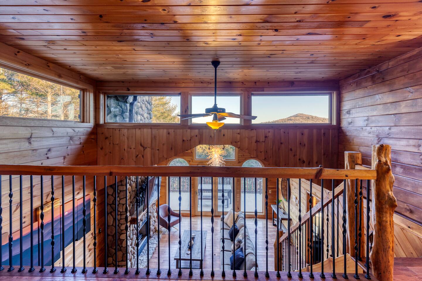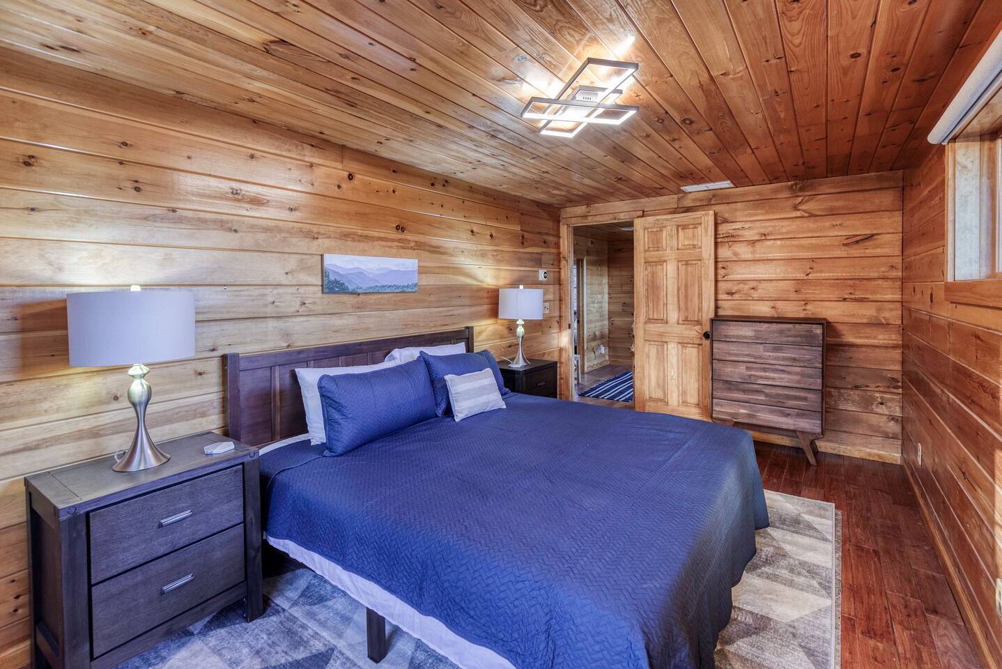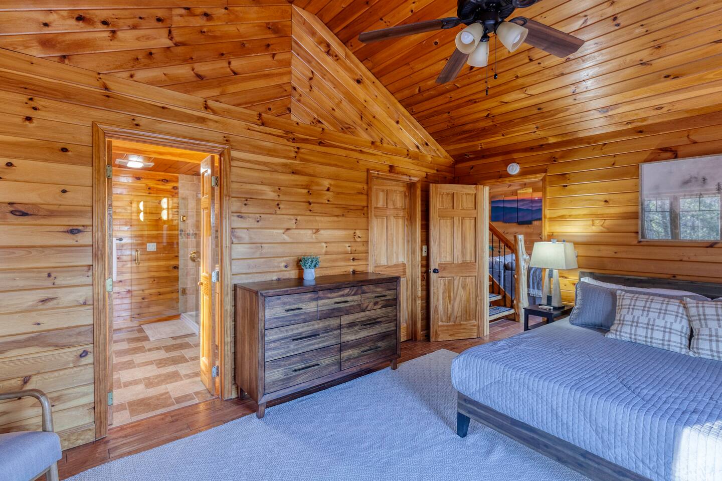 Make your way inside this custom-built cabin to experience the ultimate in entertainment, relaxation, and style all within your own secluded estate surrounded by trees and stunning mountain views. The living space is the heart of the home with high vaulted ceilings and a wall of custom windows filling the space with light. Here you can relax on the large modular lounge while you stream all your favorites on the wall-mounted TV by the warming stone fireplace. Step down into the modern kitchen that comes fully equipped with everything you could need for your stay. There is a full-size fridge/freezer, a large oven and stovetop, a microwave, and even a dishwasher to take care of all the cleaning up. Enjoy your meals surrounded by friends and family at the dining table, or head outside and eat alfresco style on the wrap-around porch or down below with a BBQ area, an outdoor fireplace, and an outdoor lounge to keep you comfortable. You are spoilt for choice with a selection of six bedrooms over the three levels of the cabin. Each room offers comfortable beds topped in soft, quality linen and plenty of space to unpack and make yourself at home. The master bedroom on the main floor consists of a luxuriously large king bed, access to the porch, and an adjoining ensuite with a large shower and a relaxing jacuzzi that sits by the bay window. Upstairs you will find an additional two king bedrooms along with a queen bedroom and a central bathroom with a dual vanity filled with all the essentials and plenty of soft, fluffy towels. On the basement level are an additional full bathroom, the fifth bedroom with a king bed, and the bunk room with four twin beds that shares its space with a fun games room where you can play poker, get out a board game, play pool or get a high score on the arcade games. From here guests can step out into the expansive yard, take a dip in the warm hot tub, sit by the pond, light up the fire pit and roast marshmallows or just take in the stunning scenery and explore the wooded areas. So for a true mountain escape that offers all the modern comforts of home while still being conveniently located just 20 minutes to Downtown Blue Ridge and only minutes to all the fun, adventure, and excitement that this area has to offer – look no further than this stylish lodge style cabin for your next getaway.