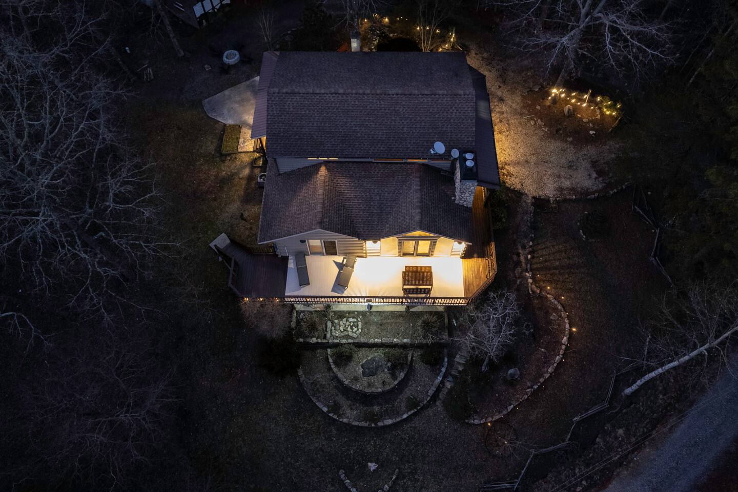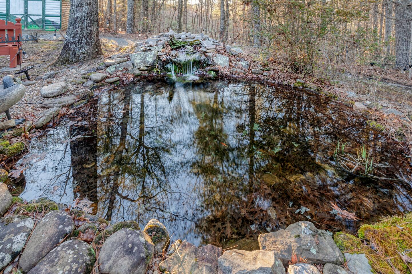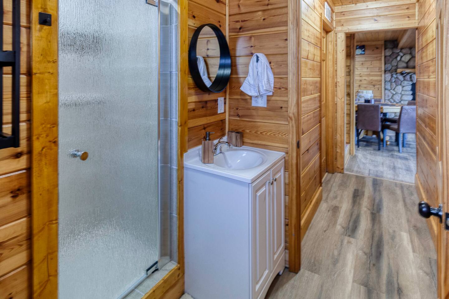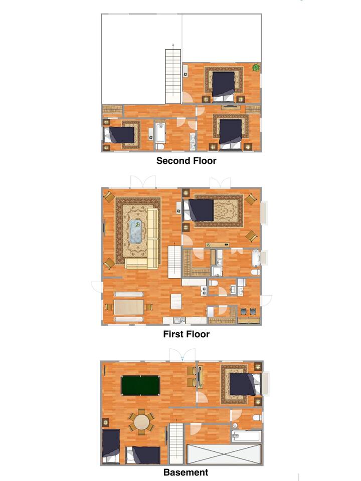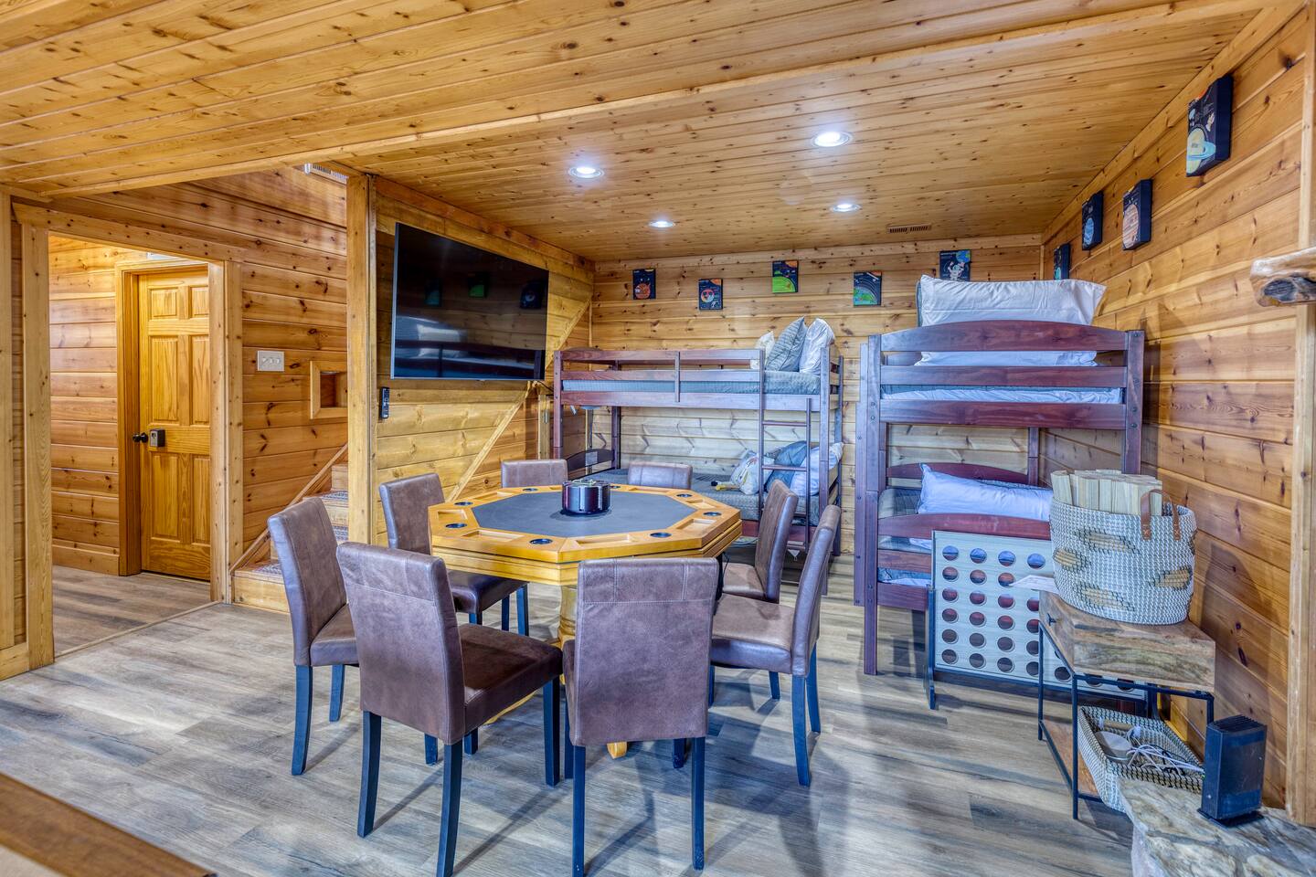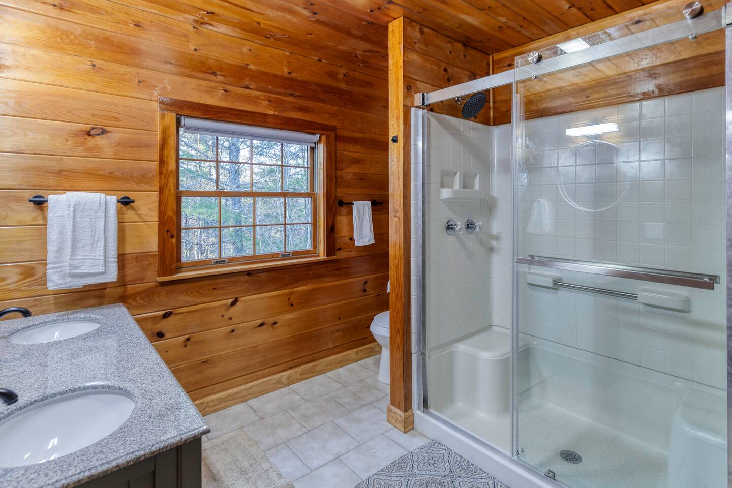 Make your way inside this custom-built cabin to experience the ultimate in entertainment, relaxation, and style all within your own secluded estate surrounded by trees and stunning mountain views. The living space is the heart of the home with high vaulted ceilings and a wall of custom windows filling the space with light. Here you can relax on the large modular lounge while you stream all your favorites on the wall-mounted TV by the warming stone fireplace. Step down into the modern kitchen that comes fully equipped with everything you could need for your stay. There is a full-size fridge/freezer, a large oven and stovetop, a microwave, and even a dishwasher to take care of all the cleaning up. Enjoy your meals surrounded by friends and family at the dining table, or head outside and eat alfresco style on the wrap-around porch or down below with a BBQ area, an outdoor fireplace, and an outdoor lounge to keep you comfortable. You are spoilt for choice with a selection of six bedrooms over the three levels of the cabin. Each room offers comfortable beds topped in soft, quality linen and plenty of space to unpack and make yourself at home. The master bedroom on the main floor consists of a luxuriously large king bed, access to the porch, and an adjoining ensuite with a large shower and a relaxing jacuzzi that sits by the bay window. Upstairs you will find an additional two king bedrooms along with a queen bedroom and a central bathroom with a dual vanity filled with all the essentials and plenty of soft, fluffy towels. On the basement level are an additional full bathroom, the fifth bedroom with a king bed, and the bunk room with four twin beds that shares its space with a fun games room where you can play poker, get out a board game, play pool or get a high score on the arcade games. From here guests can step out into the expansive yard, take a dip in the warm hot tub, sit by the pond, light up the fire pit and roast marshmallows or just take in the stunning scenery and explore the wooded areas. So for a true mountain escape that offers all the modern comforts of home while still being conveniently located just 20 minutes to Downtown Blue Ridge and only minutes to all the fun, adventure, and excitement that this area has to offer – look no further than this stylish lodge style cabin for your next getaway.