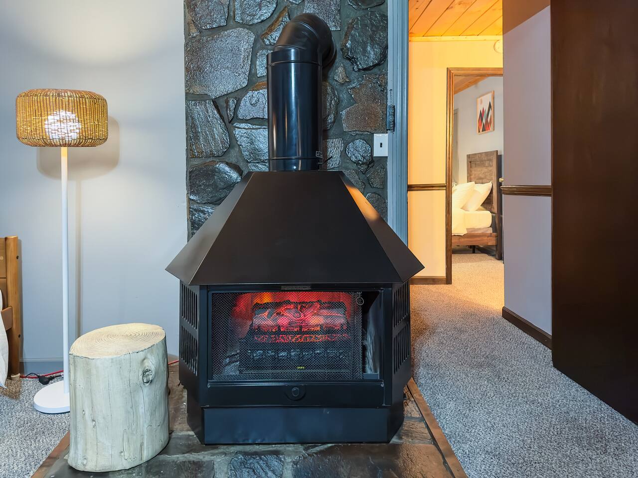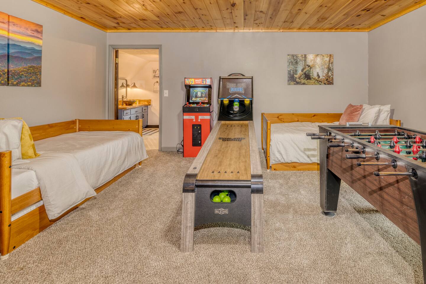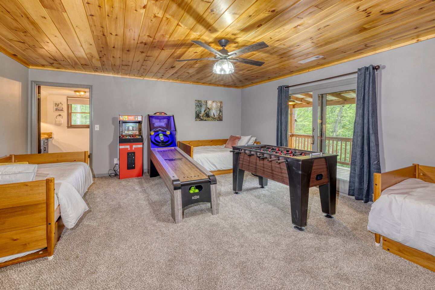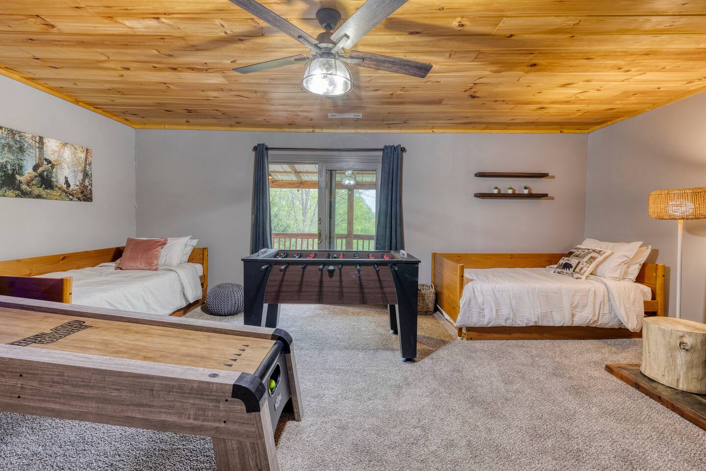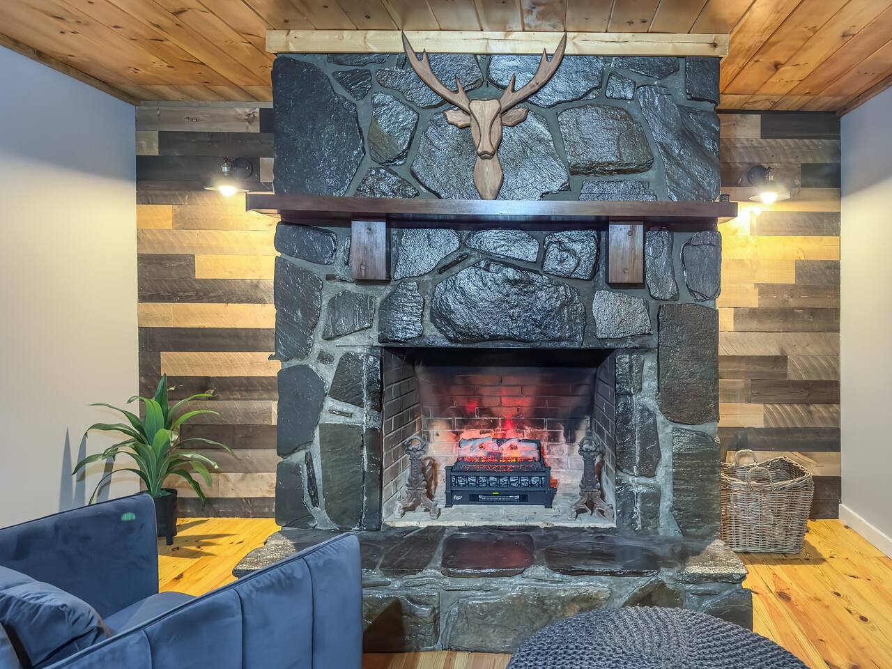 When the great outdoors is calling there is no better way to get back to nature than within this stunning custom built Chalet that gives you the ultimate in luxurious seclusion being the only home on the mountain. Make your way through the front door and feel instantly at home as you enter the spacious, open concept living room with double glass doors that lead out onto the decked balcony giving you uninterrupted views out over the woods. Watch a movie with the family on the leather lounge with the fireplace keeping everyone warm, then cook up a delicious dinner in the charming, fully equipped kitchen with all the large and small appliances you could need and a dishwasher to take care of all the cleaning up. Eat together at the stylish dining table by the bay window or up at the breakfast bar that also doubles as the perfect workspace with free WiFi to keep you connected and a coffee machine to keep you fuelled up. After a day of adventure, you’ll have four spacious bedrooms to choose from with each offering comfortable beds topped in soft, quality linen along with plenty of space to unpack • Master Bedroom – King Bed, Balcony Access, Ensuite & Smart TV • Bedroom Two – King Bed & Smart TV • Bedroom Three – Queen Bed & Twin Bed • Bedroom Four – Three Twin Beds, Three Pull Out Trundles, Ensuite & Games Along with the lavish stone wall master ensuite and the half bath on the main floor, you’ll find a second full bathroom upstairs. Each bathroom comes well appointed with all the essentials for your stay along with plenty of soft fluffy towels for each guest. The fun games room (within bedroom four) offers plenty for kids and the young at heart to enjoy with a foosball table, a skeeball game and an arcade machine. From here you can also gain access to the upper balcony or keep the doors closed on a cool night and light the fire to keep toasty warm. While the kids are playing upstairs, the lower deck is the place to be with a BBQ, alfresco dining and the luxurious hot tub overlooking the woods. Then after dark, light up the fire pit and enjoy a drink or two with a big bag of marshmallows to top off another day in paradise. So if you are looking for a true escape to the mountains with civilization only a 20 minute drive away and all the fun of the mountain and its attractions all close by – look no further than this picture perfect Chalet set over 50 acres of secluded, mountain bliss.