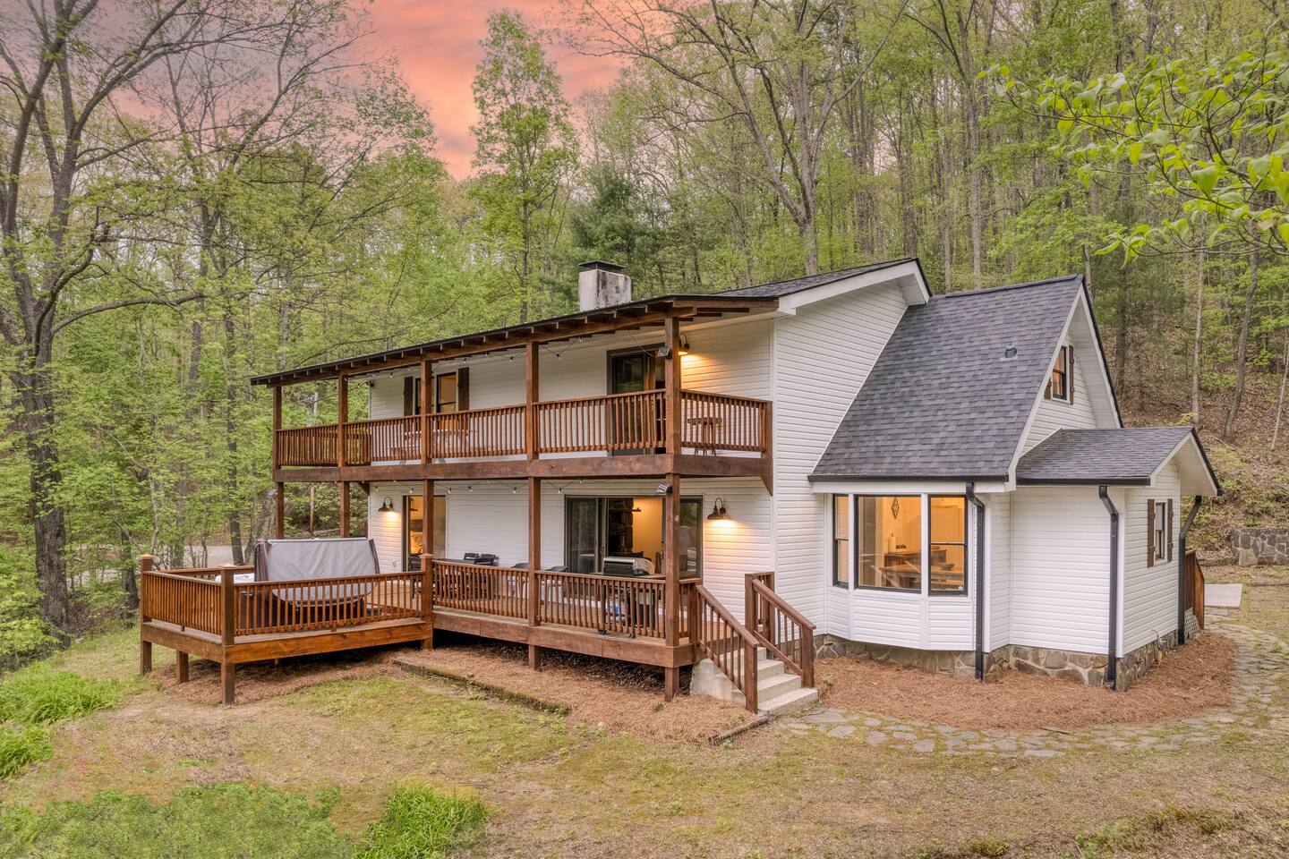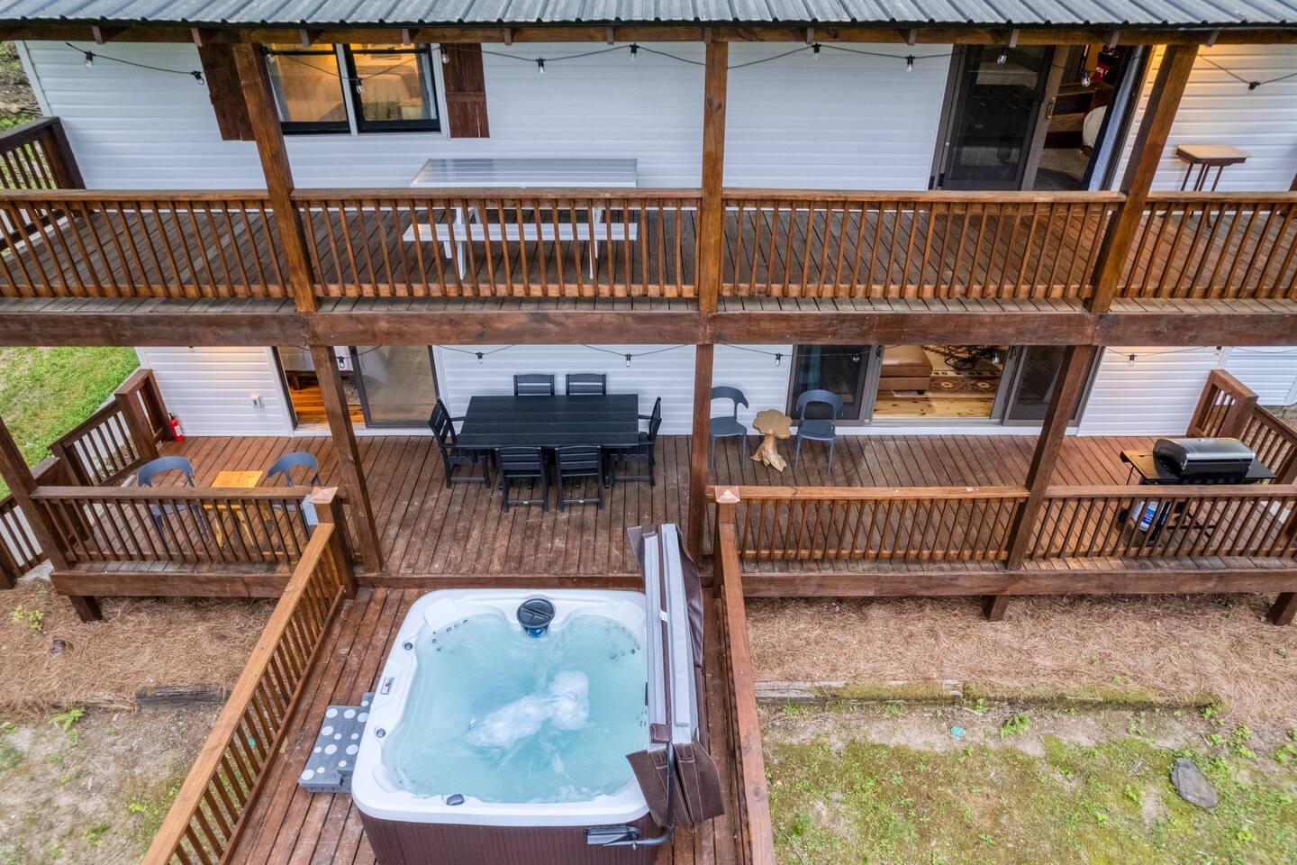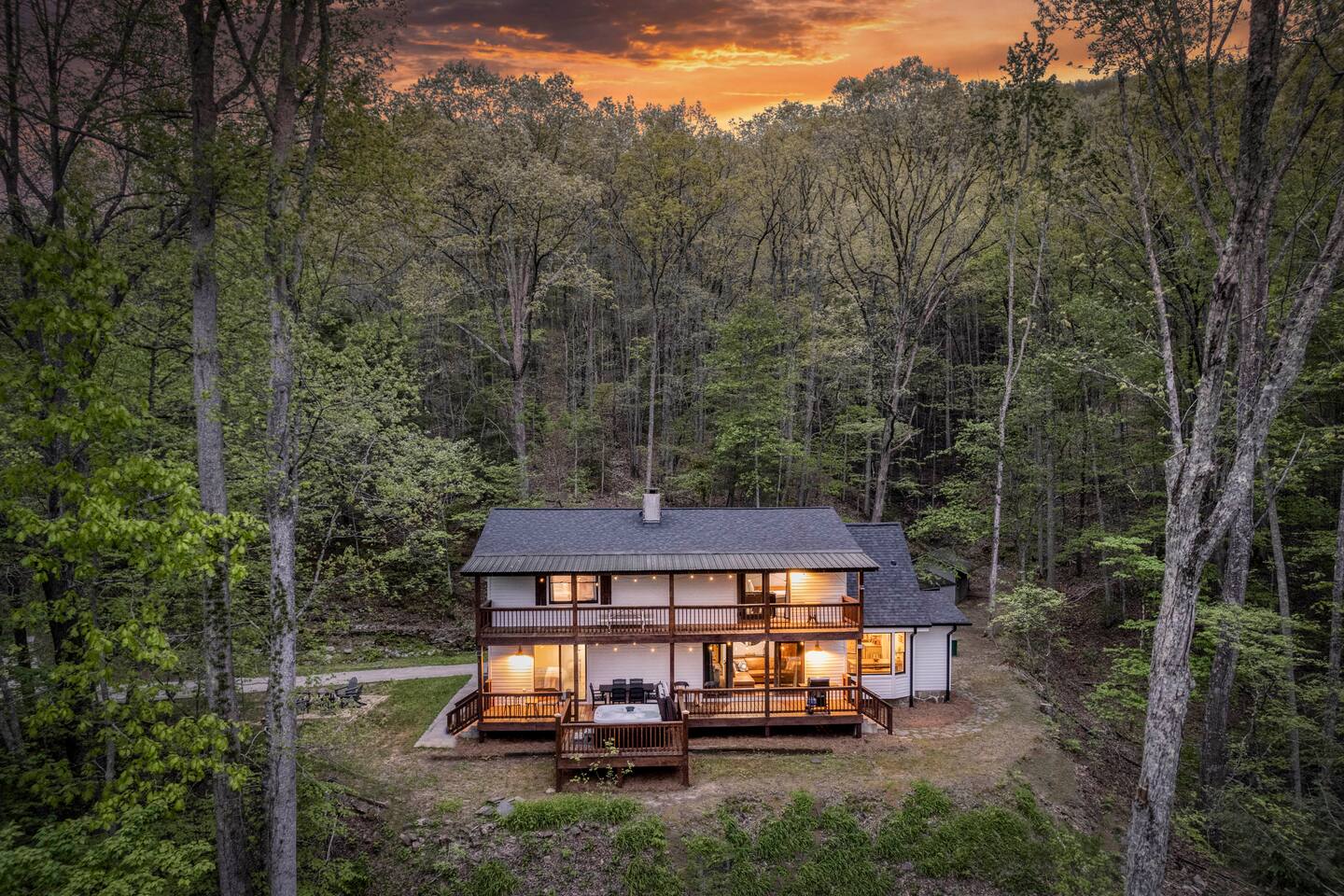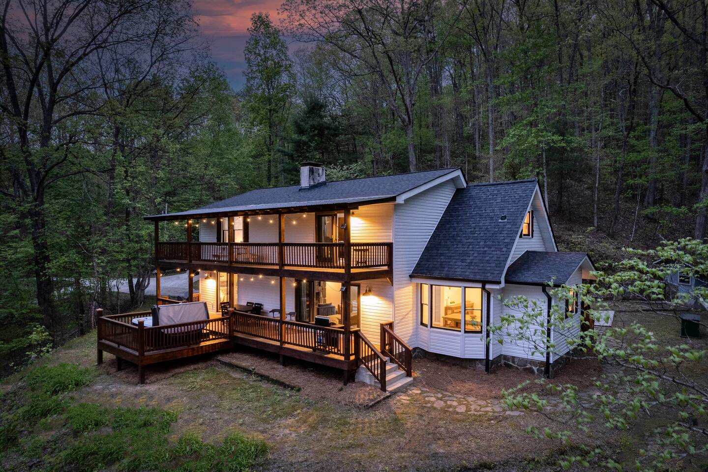 Be the king of the mountain within this incredible 2023 renovated custom-built chalet surrounded by 50 acres of secluded, lush forest. The chalet offers 2 levels of luxury mountain living with a fully equipped kitchen, open plan living, 4 bedrooms, modern bathrooms, a fun games room and two balconies with stunning views from the hot tub. You’ll be just 20 mins from Blue Ridge & McCaysville villages and easy access to restaurants, vineyards, horse riding, hiking, tubing and so much more!